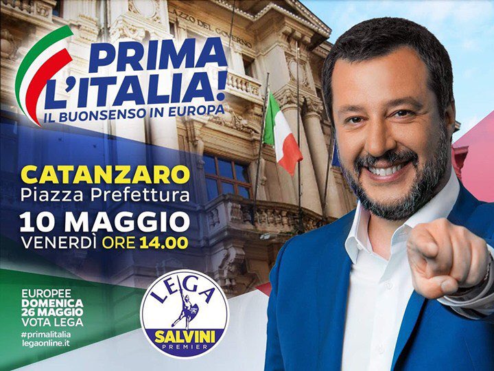 Amici, in partenza direzione Calabria. Vi aspetto alle 14 a Catanzaro, in Piazza Prefettura. Questa mattina sarò inoltre a Platí per riconsegnare a una parrocchiua una proprietà confiscata alla ‘ndrangheta. #primalitalia #26maggiovotoLega