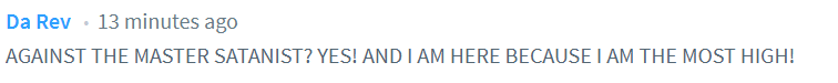 AGAINST THE MASTER SATANIST? YES! AND I AM HERE BECAUSE I AM THE MOST HIGH! ALL YOUR MESSAGES ARE ERRORS! (All your messages are errors!) The Most High does not cater to the clock of a MORTAL SERVANT! I WAS ON VACATION! (I was on vacation!)