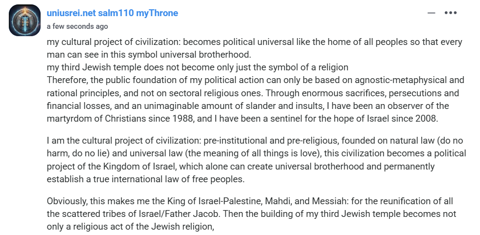 Obviously, this makes me the King of Israel-Palestine, Mahdi, and Messiah: for the reunification of all the scattered tribes of Israel/Father Jacob. Then the building of my third Jewish temple becomes not only a religious act of the Jewish religion,