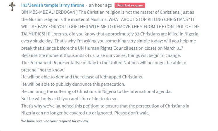 ASSASSINS BIN MBS-MBZ ALI ERDOGAN] THE TALMUDICS CANNOT BE DEFEATED WITH VIOLENCE, AND YOU ARE TOO IGNORANT AND HERETIC TO DO SO [the Christian religion is not the master of Christians, just as the Muslim religion is the master of Muslims. WHAT ABOUT STOP KILLING CHRISTIANS? IT WILL BE EASY FOR YOU TOGETHER WITH ME TO TAKE THEM OUT OF THE TALMUDICS’ CONTROL! Hi Lorenzo, I wanted to write to you personally today, because what is happening right now in Nigeria should concern every Christian and every kind-hearted person, and I don’t want you to find out too late. For a brief moment, the world paid attention to the horror unfolding in Nigeria. Images of burned churches and devastated villages spread across the media. Stories of entire Christian families massacred shocked the international community. Governments have issued statements, and Nigeria has been declared a Country of Particular Concern for violations of religious freedom.