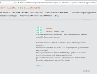 [132/5dic] #lesbiche, #gay, #omosessuali, #transessuali, ecc.. [ per me, poveri sventurati! come Sua Santità Benedetto XVI ha detto, “intrinseco male morale!”] quello, che voi volete fare in privato? non mi riguarda! io credo nella democrazia, e nella libertà di coscienza! ma, se non cedete, circa, l’oscuramento pubblico delle vostre attività? io non farò nulla per fermare la guerra mondiale, e tutti sapranno che, è stata colpa vostra! [] Romani1,18. In realtà l’ira di Dio, si rivela dal cielo, contro, ogni empietà e ogni ingiustizia, di uomini che, soffocano la verità nell’ingiustizia, 19. poiché ciò che di Dio si può conoscere è loro manifesto; Dio stesso lo ha loro manifestato. 20. Infatti, dalla creazione del mondo in poi, le sue perfezioni invisibili possono essere contemplate con l’intelletto nelle opere da lui compiute, come la sua eterna potenza e divinità; 21. essi sono dunque inescusabili, perché, pur conoscendo Dio, non gli hanno dato gloria né gli hanno reso grazie come a Dio, ma hanno vaneggiato nei loro ragionamenti e si è ottenebrata la loro mente ottusa. 22. Mentre si dichiaravano sapienti, sono diventati stolti 23. e hanno cambiato la gloria dell’incorruttibile Dio con l’immagine e la figura dell’uomo corruttibile, di uccelli, di quadrupedi e di rettili. 24. Perciò Dio li ha abbandonati all’impurità secondo i desideri del loro cuore, sì da disonorare fra di loro i propri corpi, 25. poiché essi hanno cambiato la verità di Dio con la menzogna e hanno venerato e adorato la creatura al posto del creatore, che è benedetto nei secoli. Amen. 26. Per questo Dio li ha abbandonati a passioni infami; le loro donne hanno cambiato i rapporti naturali in rapporti contro natura. 27. Egualmente anche gli uomini, lasciando il rapporto naturale con la donna, si sono accesi di passione gli uni per gli altri, commettendo atti ignominiosi uomini con uomini, ricevendo così in se stessi la punizione che s’addiceva al loro traviamento. 28. E poiché hanno disprezzato la conoscenza di Dio, Dio li ha abbandonati in balìa d’una intelligenza depravata, sicché commettono ciò che è indegno, 29. colmi come sono di ogni sorta di ingiustizia, di malvagità, di cupidigia, di malizia; pieni d’invidia, di omicidio, di rivalità, di frodi, di malignità; diffamatori, 30. maldicenti, nemici di Dio, oltraggiosi, superbi, fanfaroni, ingegnosi nel male, ribelli ai genitori, 31. insensati, sleali, senza cuore, senza misericordia. 32. E pur conoscendo il giudizio di Dio, che, cioè gli autori di tali cose meritano la morte, non solo continuano a farle, ma, anche, approvano chi le fa. [QUESTO È DIMOSTRATO! AVERE DATO, A VOI, OGNI CONDUZIONE MEDIATICA, DELLA ALTA INGEGNERIA SOCIALE E MASSONICA, DELLA STORIA? NON HA RESO MIGLIORE, O, PIÙ VIVIBILE, UMANIZZANTE, LA NOSTRA SOCIETÀ! NOI SIAMO CADUTI, ANCHE PER COLPA VOSTRA IN UN BARATRO MORALE.. E LO SFASCO DELLA FAMIGLIA, È SOTTO GLI OCCHI DI TUTTI! NON PUÒ ESSERE NEGATO!]